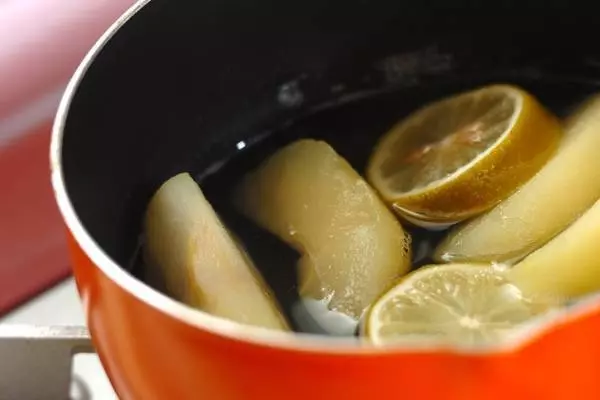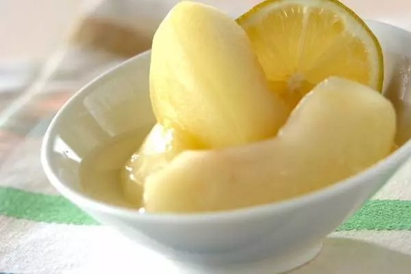 1、リンゴは8等分のくし切りにして皮をむく。レモンは幅1cmぐらいの輪切りにする。
