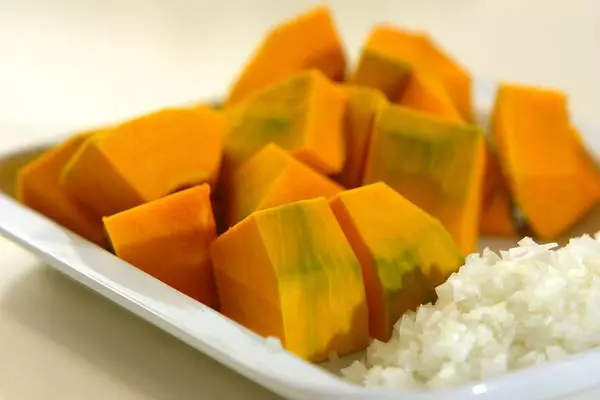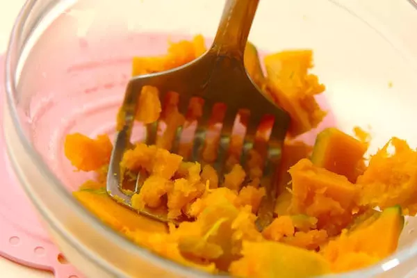 1、耐熱容器にカボチャを並べ、ラップをかけて電子レンジで4~5分加熱して、マッシャーなどで潰す。
