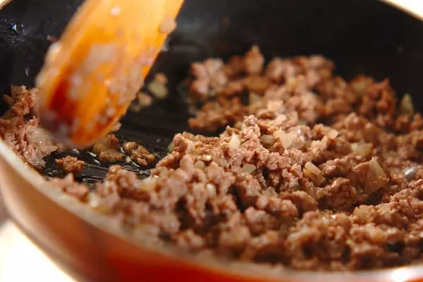 2、フライパンにオリーブ油を熱し、玉ネギを入れて中火で炒め、玉ネギが透き通ってきたら合いびき肉を加えて炒める。合いびき肉がポロポロになったら、カレー粉、塩コショウを加えて混ぜ合わせる。