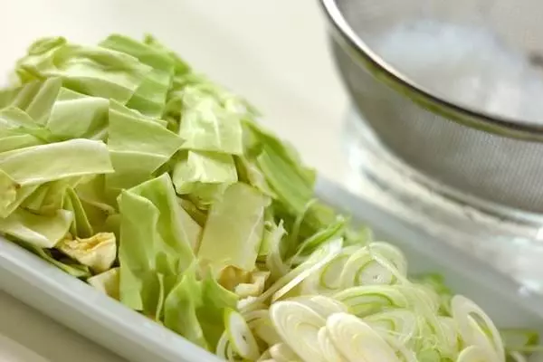 ・キャベツは軸を削ぎ切りにし、葉をザク切りにする。白ネギは斜め薄切りにする。春雨はかためにゆでてザルに上げ、食べやすい長さに切る。