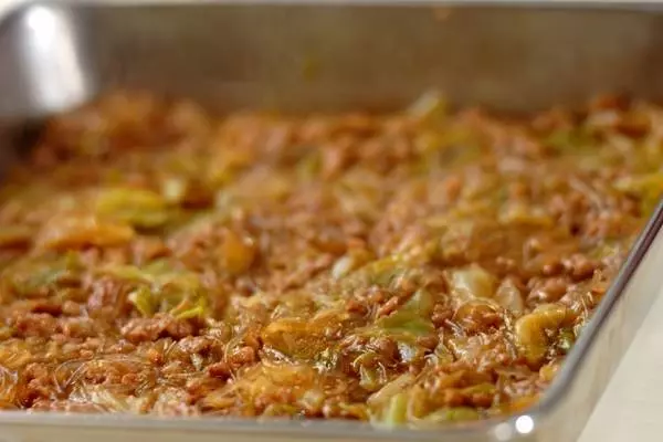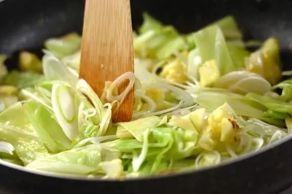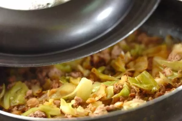 1、フライパンにサラダ油、キャベツ、白ネギを入れて強めの中火で炒める。しんなりしてきたら豚ひき肉を加えて炒め合わせる。