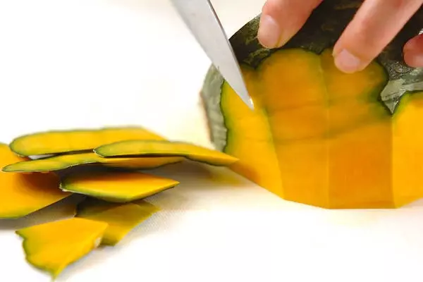 ・サツマイモ、ジャガイモは皮をむいて、カボチャは種とワタを取って皮を削ぎ落とし、大きめのひとくち大に切って、それぞれ水に放つ。