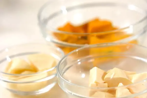 1、サツマイモ、ジャガイモ、カボチャは濡れたままそれぞれ耐熱ボウルに入れ、ふんわりラップをして電子レンジでやわらかくなるまで8~10分加熱する。竹串がスッと刺さったらOKです。