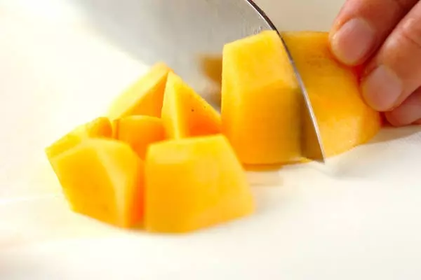 ・柿は皮をむいて種を取り除き、ザク切りにする。