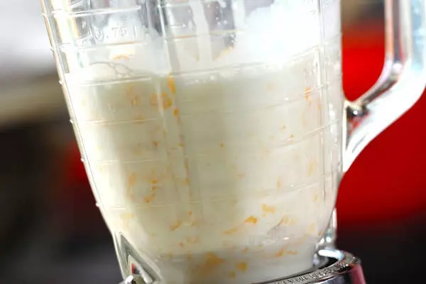 1、ミキサーにミントの葉以外の材料を入れてかくはんし、グラスに注いでミントの葉を飾る。