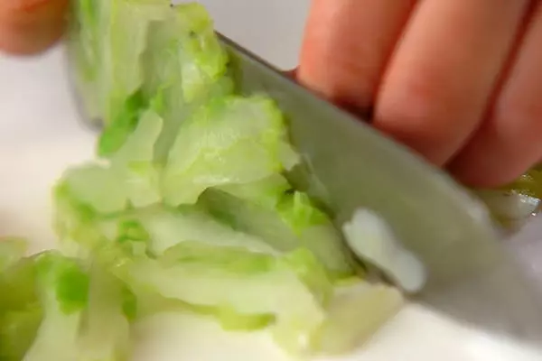・白菜は葉を1枚ずつはがして水洗いし、熱湯でゆでてザルに上げ、粗熱が取れたら水気を絞って横細切りにする。