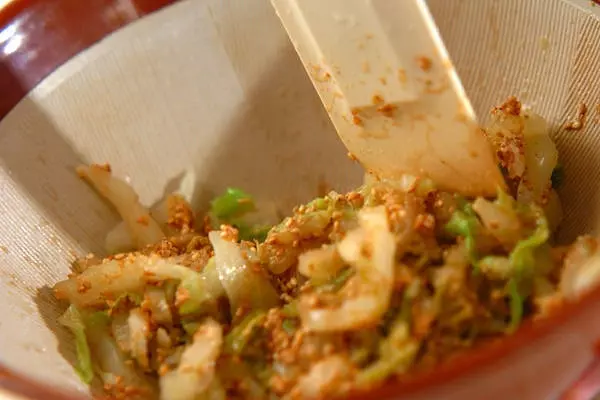 1、すり鉢で白ゴマをすり、<調味料>の材料を加えて混ぜ合わせ、白菜を入れて全体にからめ、器に盛る。