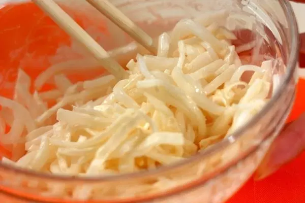 2、もうひと切れのリンゴは皮をむいてボウルにすりおろし、マヨネーズを加えて混ぜ合わせ、大根の水気を絞って加えて和える。器に盛り、細切りにしたリンゴの水気をきってのせる。