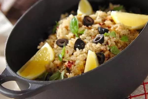 2、炊き上がったら全体をしゃもじで混ぜ器によそう。バジルは手でちぎって散らし、オリーブとレモンも添える。