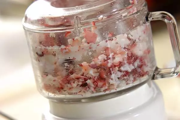 ・ゆでタコ足は分量外の塩水で洗い、水気を拭き取って大きめのひとくち大に切ってからフードプロセッサーにかけ細かくする。