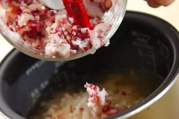 1、炊飯器にお米、<調味料>の材料を加え、通常に炊くより少し少なめの水加減で水を加え混ぜ合わせる。玉ネギ、ゆでタコ足を順にのせて炊く。