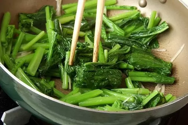 1、フライパンにサラダ油を強火で熱し、ショウガ、カブの葉を加えて炒めあわせる。