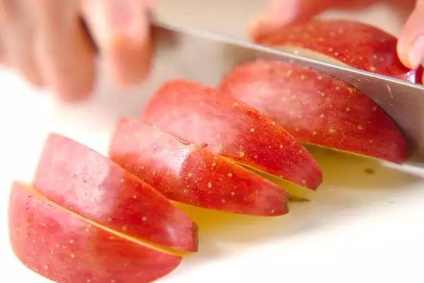 1、リンゴは半分に切り、6つのくし切りにして皮をむく。