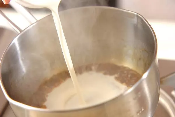 3、<キャラメルソース>を作る。鍋にグラニュー糖、フルール・ド・セル、バニラビーンズ、水を入れて火にかける。キャラメル色になったら生クリームを加え、火からおろして耐熱ボウルに移して冷ます。