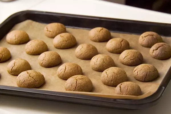 5、オーブンは180℃に温めておく。4がまとめやすくなったら30等分に分け、手の平でころがして約直径3cmのボール状にまるめ、クッキングシートを敷いた天板に、間隔をあけながら並べる。オーブンで20~30分焼く。