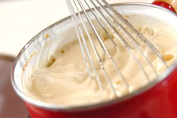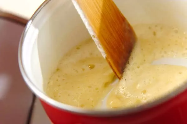 2、フツフツ泡が出てきたら、残りの牛乳250mlを一気に加え、泡立て器でダマがないように手早く混ぜ合わせ、さらに溶きのばしたみそを加え、混ぜ合わせる。塩コショウで味を調え、トロミがつくまで混ぜながら加熱する。