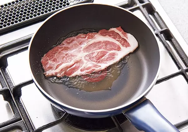 1、油を入れて予熱。フライパンの片側に肉を1枚広げて入れる。