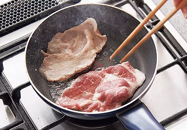 あとから入れた肉をひっくり返すタイミングで、先に焼けた肉をタワーのように重ねていく。小さなフライパンでも取り出さずに肉を何枚でも焼くことが可能。重なっている部分は、蒸し焼きの状態なので、しっかり火は通るが、かたくない仕上がりが実現。
