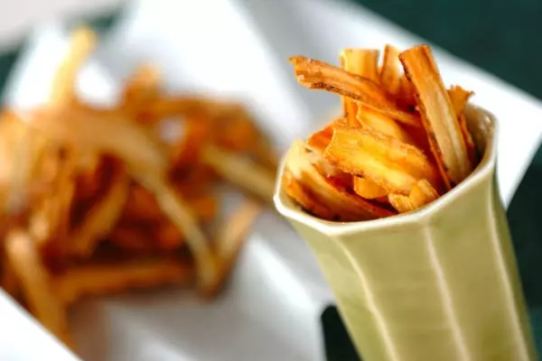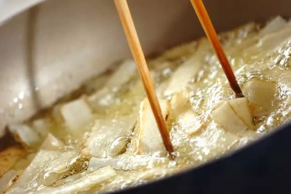 3、(1)のゴボウの水気をきれいなタオルでしっかり拭き取り、(2)の揚げ油に入れ、時々菜ばしで混ぜながら、サクッと揚げる。揚げ油をしっかりきり、器に盛って塩をかける。