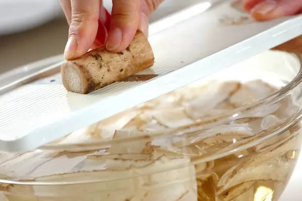 1、ゴボウはタワシでこすって水洗いし、水気を拭き取って長さ5~6cmに切る。スライサーで縦薄切りにしながら水に放ち、ザルに上げる。