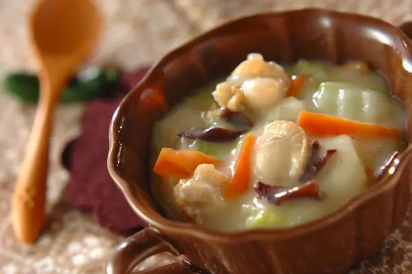 柔らかくとろける白菜に、ホタテのヒモやキクラゲのコリコリ感がアクセントになって、楽しい食感に。クリーム煮はキノコとの相性が抜群なので、シメジやエノキなどを追加すれば、さらにボリューム満点な主菜になりますよ。