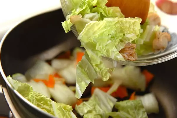 1、白菜は芯と葉に分け、葉はザク切り、芯は縦半分にして、削ぎ切りにする。ニンジンは皮をむいて縦薄切り、キクラゲはぬるま湯でもどし、細切りにする。