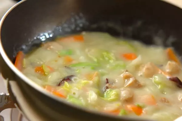 2、フライパンにサラダ油を入れ、白菜の芯、ニンジン、キクラゲを炒める。しんなりしたらホタテ、白菜の葉を加え、塩コショウをし、酒、水を入れる。