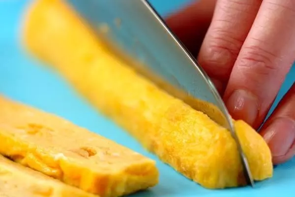 2、卵焼きを作る。サラダ油を薄くひいた卵焼き器を中火で熱し、<卵液>を数回に分けて流し入れ、卵焼きを焼く。巻きすで形を整え、冷めたら棒状に切る。