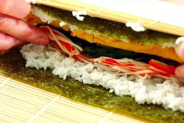 4、指で具を押さえながら、巻きすごと持ち上げ、手前側と向こう側の寿司飯の端を合わせるようにして巻く。巻き終わりを下にして形を整える。同様にもう1本巻く。切らずに器に盛る。