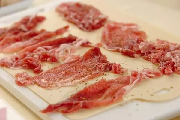 豚肉で巻いたときに隙間があるとチーズが出てくるので、チーズが豚肉からはみださないように巻いて下さい。
