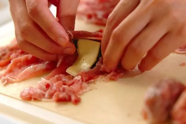1、豚肉をまな板に広げ、その上に大葉、スライスチーズをのせロール状に巻く。残りの肉も同様に巻いて、8個つくる。