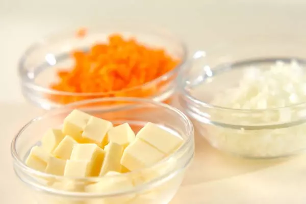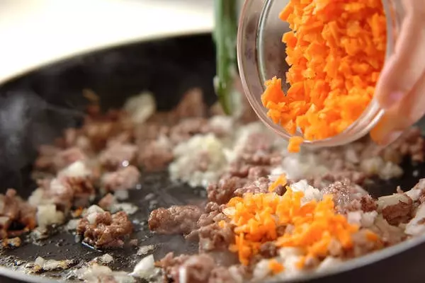 1、フライパンにバターを熱して合びき肉とニンニクを炒め、色が変わったら玉ネギとニンジンを加え、さらに炒める。