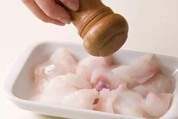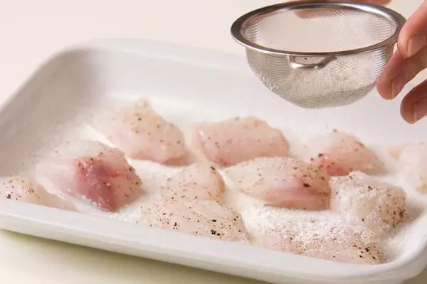 2、白身魚の水分を拭き取り、塩コショウを振りかけ薄く小麦粉をからめる。