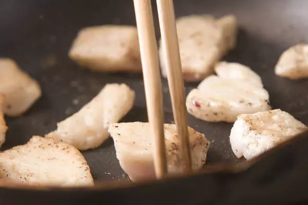 手順は白身魚を少量のゴマ油で炒め焼きして、野菜を加え甘酢あんを合わせるだけ。