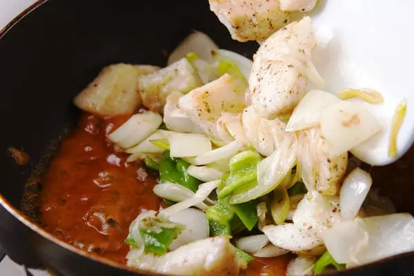 3、中華鍋又は深めのフライパンにゴマ油小2を入れ中火にかけ、(2)を炒め焼きにしていったん取り出し、残りのゴマ油を加え玉ネギ、白ネギを入れ、しんなりするまで炒めてピーマンを炒め合わせ白身魚と合わせておく。