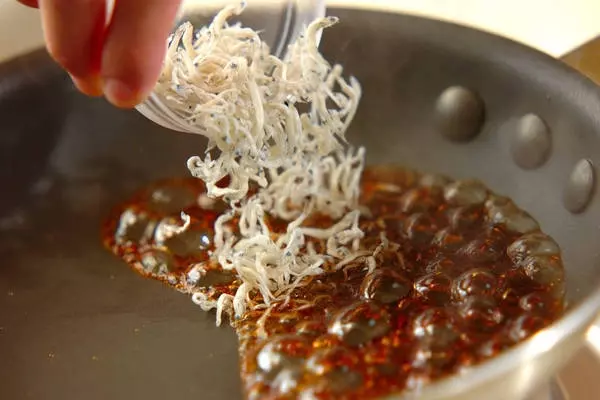 1、フライパンに<調味料>の材料を入れて強火で熱し、煮たったらチリメンジャコを加える。