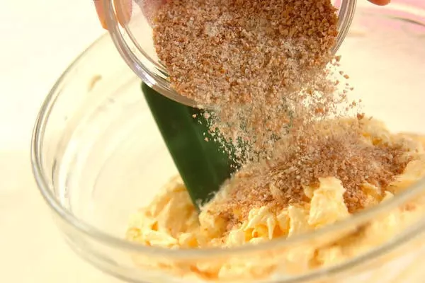 2、溶きほぐした卵を少しずつ加えて、その都度しっかり混ぜ合わせ、グラハム粉を加えて混ぜ合わせる。