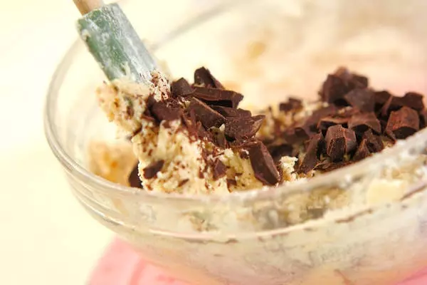 3、薄力粉とベーキングパウダーを加えてサックリと混ぜ、ダークチョコレートも加えて混ぜ合わせる。