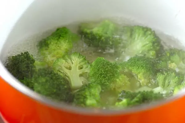2、鍋に水とオリーブ油、ブロッコリーを入れて火にかけ、煮たったら5~6分煮る。ブロッコリーが柔らかくなったらフォーク等で粗くつぶす。