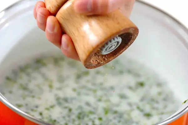 3、牛乳を加えて煮たつ直前で火を止め、ナツメグ、塩コショウを振り、器に注いで粉チーズを振る。