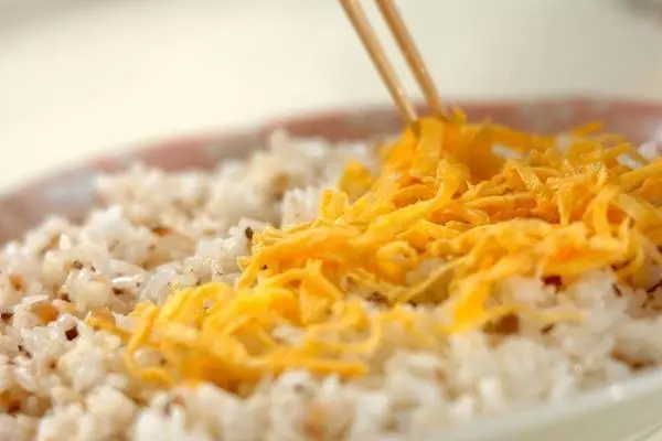5、ご飯を飯台にあけ、作り置き甘酢をかけ、しゃもじで混ぜ合わせてウチワであおぎ手早く冷ます。みじん切りにしたシイタケとレンコンを加え、混ぜ合わせる。