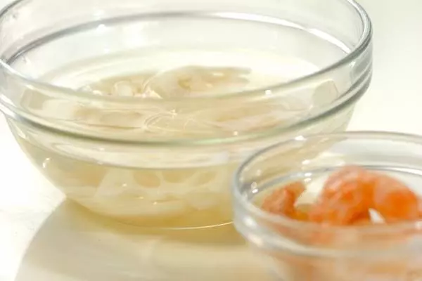 4、(3)でゆでたむきエビとレンコンを作り置き甘酢にからめる。レンコンの半量を粗くみじん切りにする。