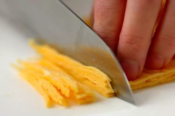 2、<錦糸卵>の材料を合わせ、サラダ油を薄くひいたフライパンで、薄焼き卵を何枚か作り、細切りにして錦糸卵を作る。