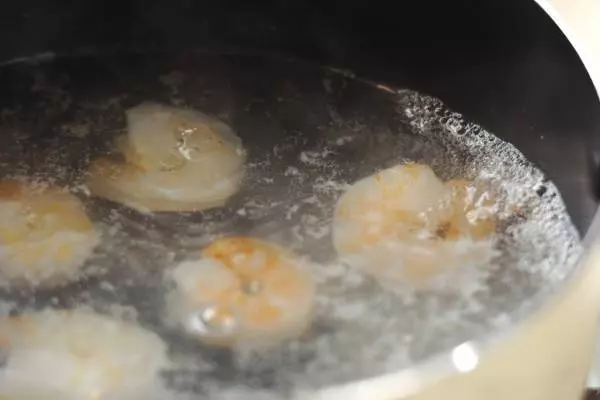 3、分量外の塩を入れた熱湯でレンコンとキヌサヤを1分程ゆでて冷水に取る。同じ鍋でむきエビをゆで、水気をきる。