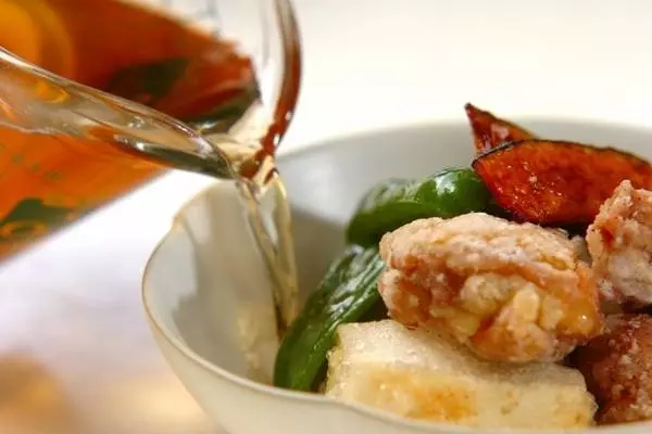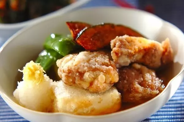 柔らかくジューシーで旨みたっぷりな鶏もも肉、豆腐、野菜を素揚げしてダシをかけた一品。食材にダシが染み込んだ絶品おかずです。