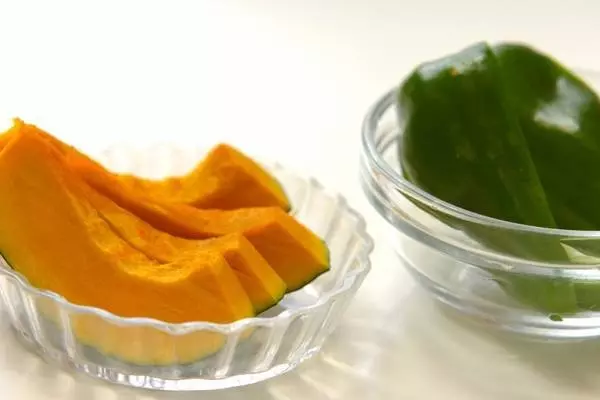 2、170℃の揚げ油でカボチャを素揚げする。ピーマンはサッと油にくぐらせる程度に揚げる。続いて木綿豆腐に片栗粉をまぶし、表面がサクッとするまで揚げる。