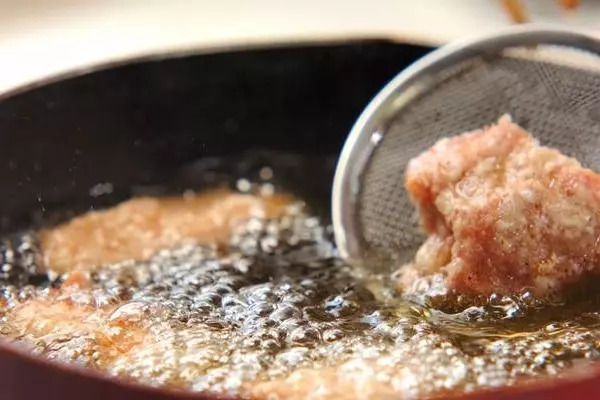 3、鶏もも肉に片栗粉をつけ、揚げ油に入れる。時々返しながら中まで火を通し、最後に強火にしてサクッと揚げる。