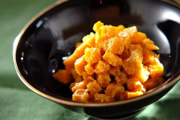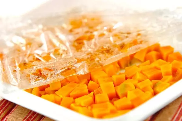 1、カボチャは皮を削ぎ落として1cm角に切り、耐熱容器に入れてラップをかけ、柔らかくなるまで電子レンジで3分加熱する。電子レンジは600Wを使用しています。