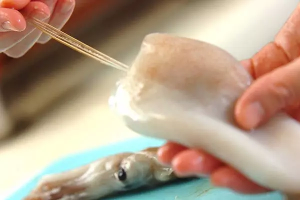 2、イカは足を持って胴から引き抜く。胴はエンペラを外して、胴の中にある軟骨を抜き取り、胴の中に流水を入れながら洗って水気をきる。引き抜いた足側は目の際でワタごと切り落とし、くちばしを取り除く。足の長さは切りそろえ、2本ずつに切り離す。胴は幅2cmの輪切りにする。エンペラはひとくち大に切る。