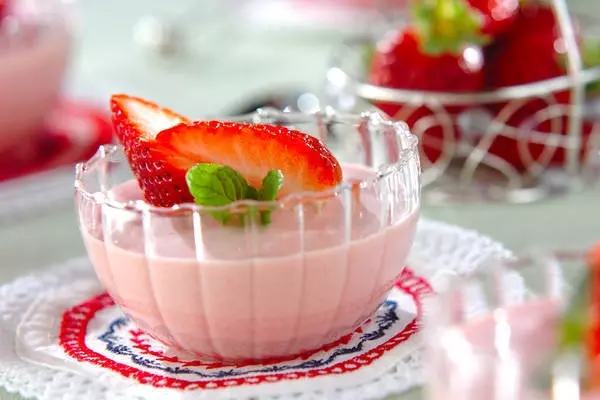 6、器に流し入れ、2時間ほど冷蔵庫で冷やしかためる。かたまったら、<デコレーション>のイチゴ、ミントの葉を飾る。
